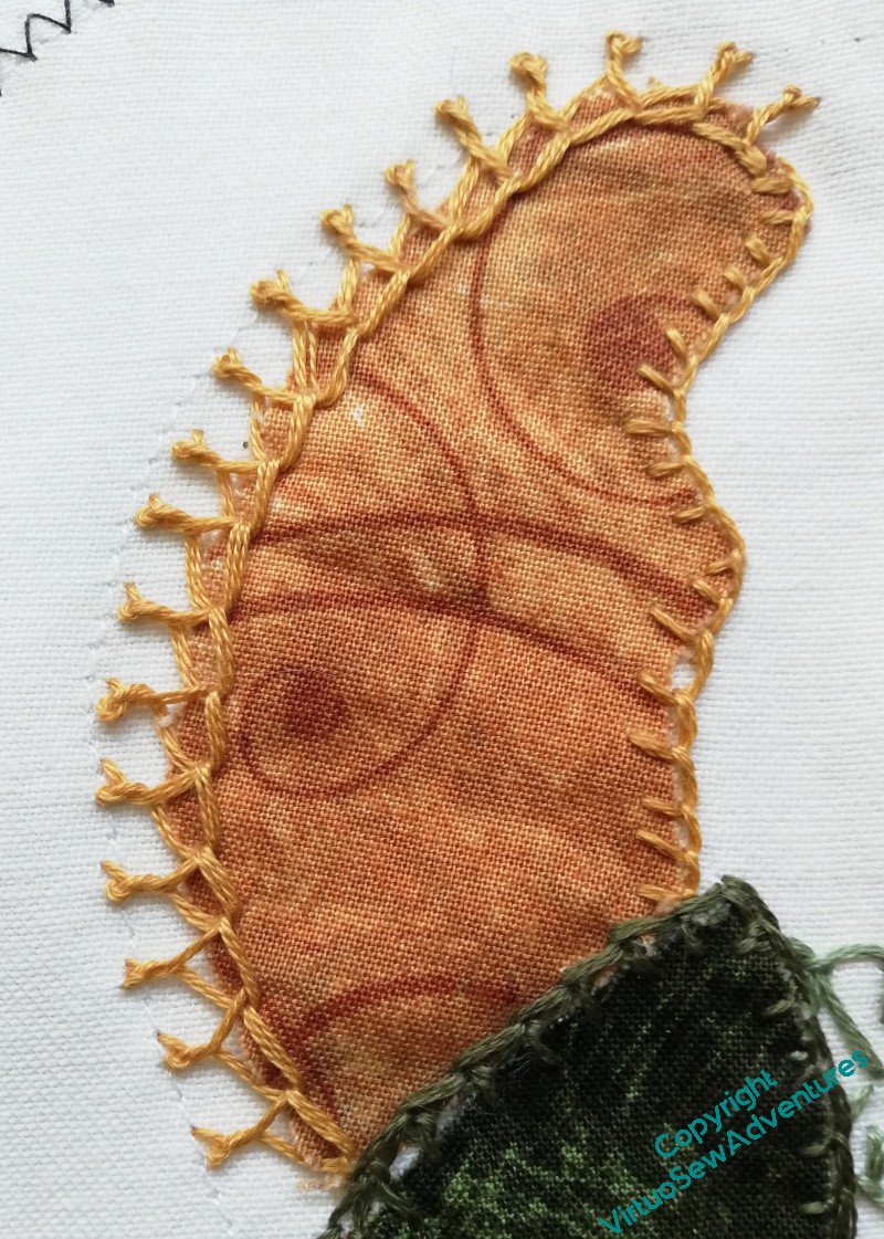 The wings are edged with crested chain stitch, and the cape has a shoulder line of closed feather stitch, and another line of petal stitch. The dress is defined with a pattern of up and down blanket stitches, since it is actually the background fabric.
