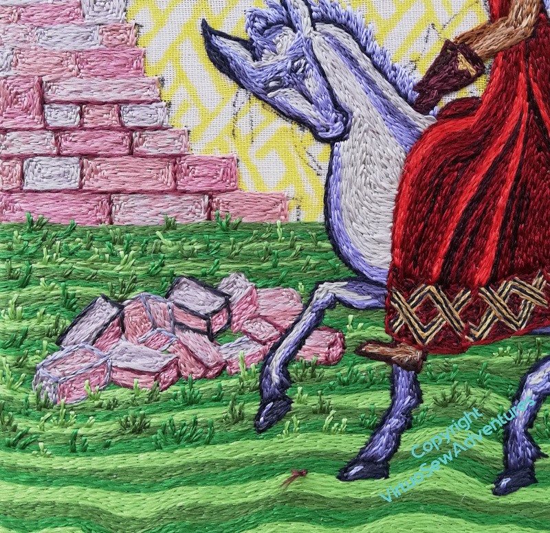 So, for example, when I first stitched outlines for the blocks, and hadn’t stitched the blocks, it looked very much too dark and out of balance, so I lost confidence, took out the outlines, and worked the blocks without them. Now that Aethelflaed is in place, darker and more emphatic than she might have been, the walls need a little more definition to stand up to her. But not too much, so this time I’m using essentially a mid tone of pinky plum. I think that’s going to work.