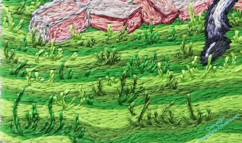 I’m also returning to the grass. You may recall that I had a thought as I was doing the early stages of the grass, thinking that it might be a good idea to increase the scale of the tussocks as I came forward. This is one of those elements which is a departure from classical opus anglicanum, as far as I know, but it is a way for me to explore some of the outer reaches of filament silk.