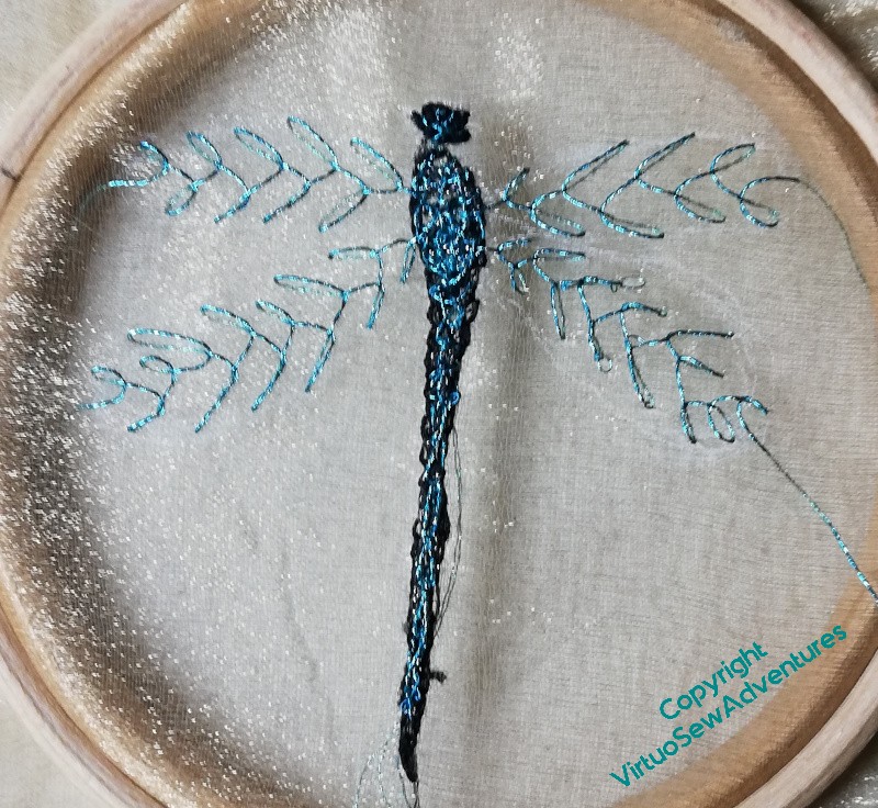I find dragonflies and damselflies absolutely enchanting. I’m not entirely sure that I’ve got the right sense of delicacy and enchantment here – the threads are a little clunky, maybe, and the metallic thread wants a conditioner or something else to protect it as I work. I wanted to use a longish thread so that I didn’t have lots of tyings-off, but that just meant more opportunity for tangles.