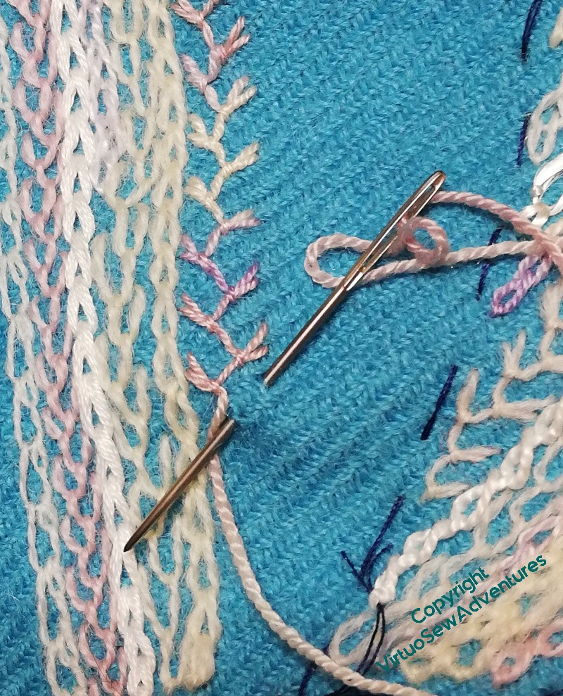 I have a slight fear that I may even have to remove all of it. I love Portuguese Knotted Stem Stitch, but it is full of personality, and if I don’t get the balance right in the rest of the stitching it might unbalance the whole thing!