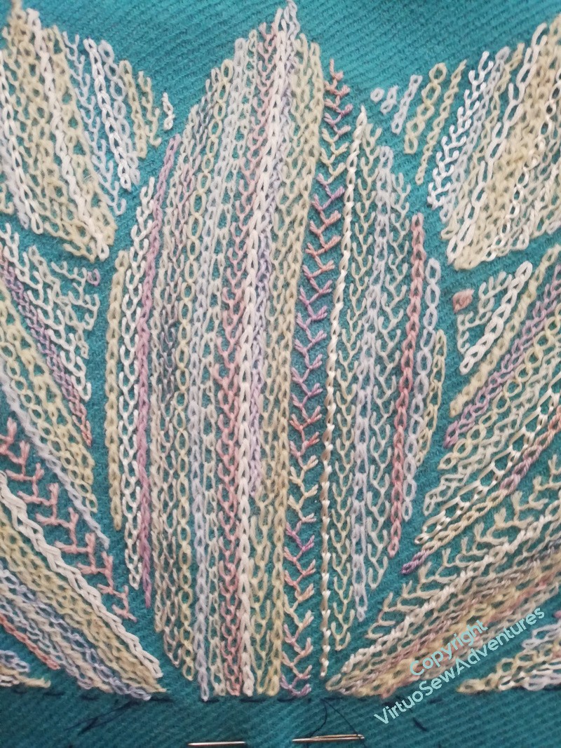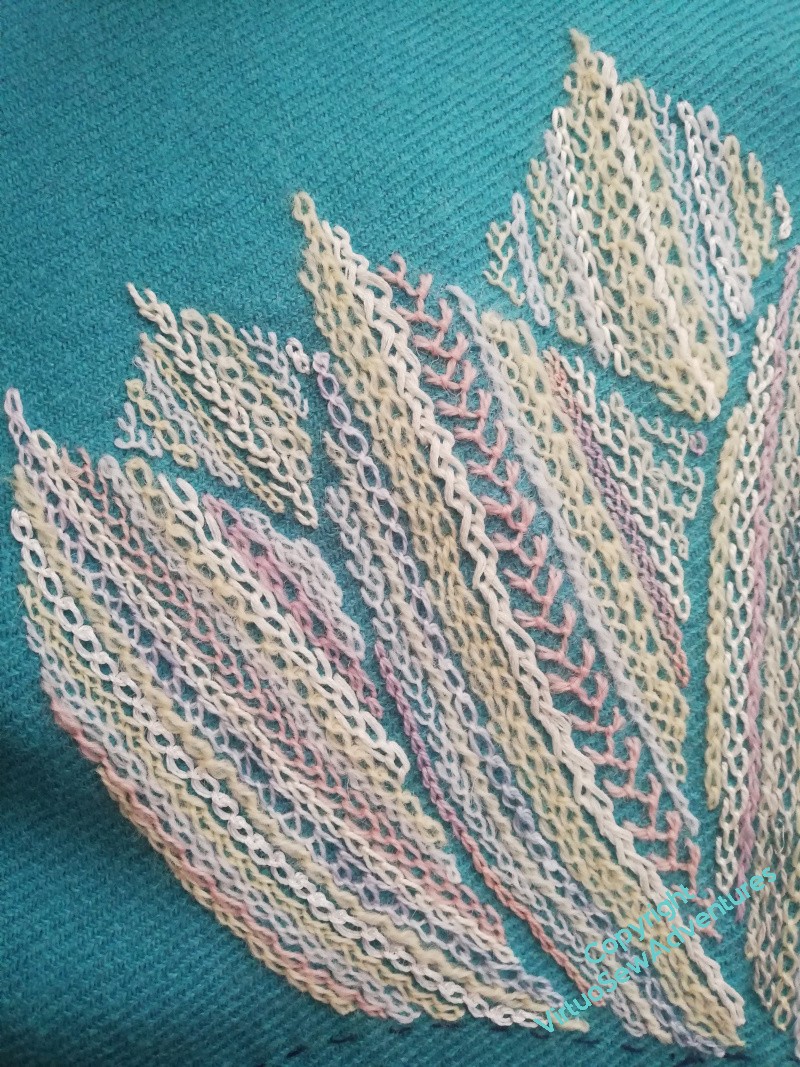 So here we go.. Hungarian Braided Chain for the bird’s head and back – see how it’s not such a thirsty stitch as the Mountmellick Thorn, so the colour changes spread out more? Vandyke stitch to separate the feathers, Cretan Stitch for the crest, Coral stitch in various other places.