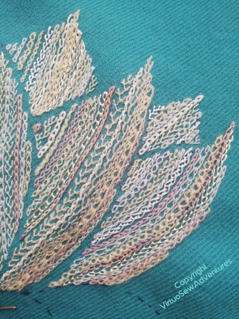 The tendrils are now all in Coral Stitch, and the stems are a Feather Stitch variation. I’ve not been able to track it down, but it’s created a loose and pretty plaited effect that I’m very pleased with!